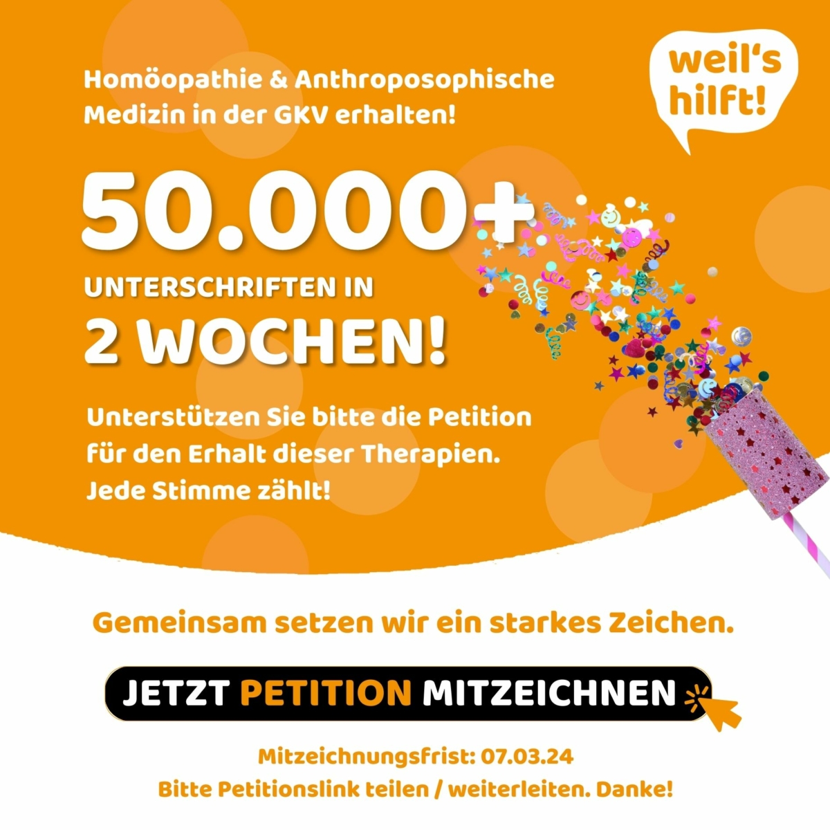 in nur 18 Tagen haben wir das Minimal-Ziel von 50.000 Unterschriften für unsere Bundestagspetition zum Erhalt der Homöopathie und Anthroposophischen Medizin in der GKV erreicht. Ein schöner Erfolg! Doch nun bleibt uns bis zum 7. März Zeit, im Endspurt noch neue Marken zu setzen. Also weiter mitmachen, Patientinnen und Patienten ansprechen und informieren. Hier ist noch einmal der Link, der bestimmt auch Platz auf Ihrer Webseite Platz hat: https://epetitionen.bundestag.de/petitionen/_2024/_01/_27/Petition_162857.nc.html